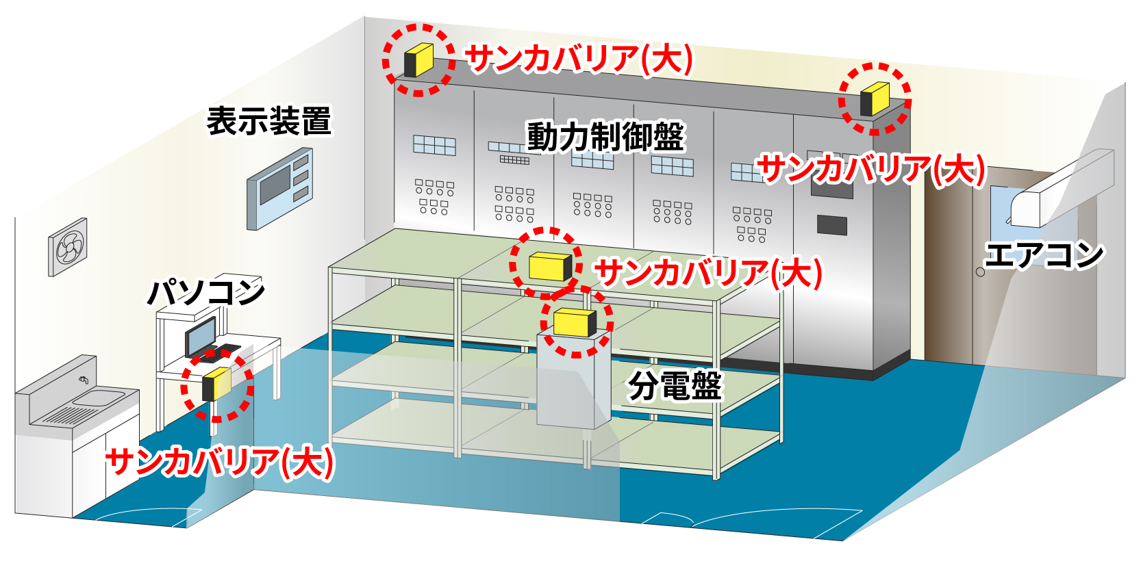 管理室内にサンカバリアを分散して設置し、室内全体に防錆成分が行き渡るよう対策を行いました。